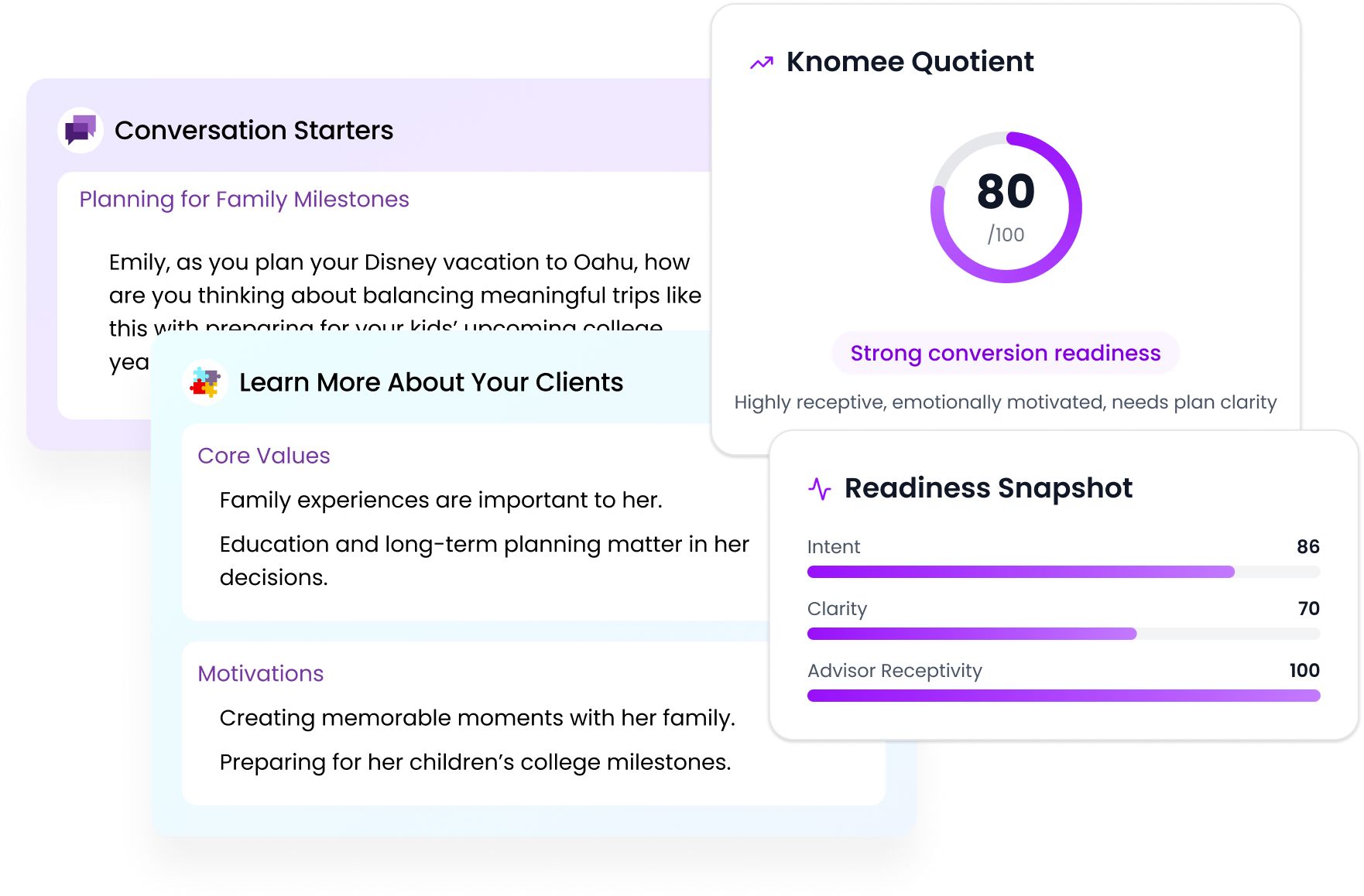 By delivering deeper client understanding, Knomee uncovers new planning and product opportunities, boosts loyalty, and builds relationships with household members to retain clients during life transitions.